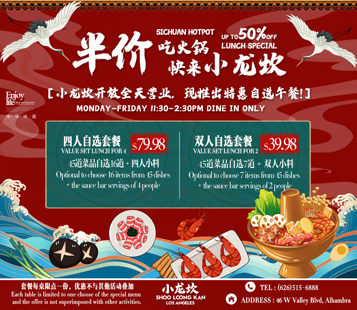 Whether you're new to hot pot or a seasoned enthusiast, the menu supports a variety of tastes and dining rhythms—from quick lunches that still feel special to longer dinners meant for savoring. The variety of meats, fresh produce, and side dishes allows you to tailor the meal to your preference, making every visit feel approachable and satisfying.